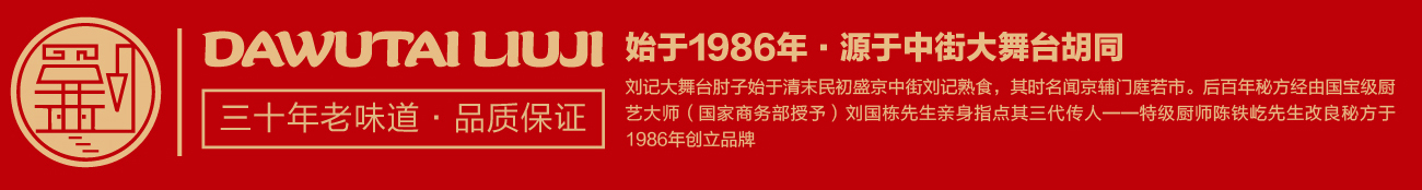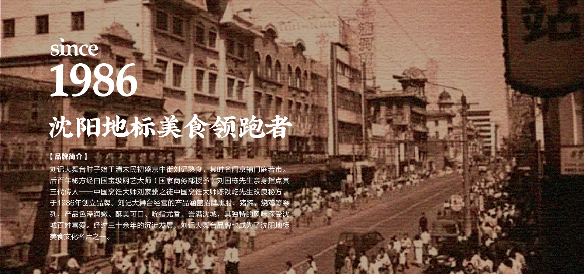 盛京,昔乃大清王朝發(fā)祥之地。劉記大舞臺(tái)肘子始于清末民初盛京中街劉記熟食,其時(shí)名聞京輔門(mén)庭若市。后百年秘方經(jīng)由國(guó)寶級(jí)廚藝大師(國(guó)家商務(wù)部授予)劉國(guó)棟先生親身指點(diǎn)其三代傳人——中國(guó)烹飪大師劉家驥之徒中國(guó)烹飪大師陳鐵屹先生改良秘方,于1986年創(chuàng)立品牌。劉記大舞臺(tái)經(jīng)營(yíng)的產(chǎn)品涵蓋招牌熏肘,豬蹄,燒雞等系列,產(chǎn)品色澤潤(rùn)嫩、酥美可口、吮指尤香、譽(yù)滿(mǎn)沈城,遂成古今絕味,其獨(dú)特的風(fēng)味深受沈城百姓喜愛(ài)。經(jīng)過(guò)三十余年的沉淀發(fā)展,劉記大舞臺(tái)品牌也成為了沈陽(yáng)地標(biāo)美食文化名片之一。